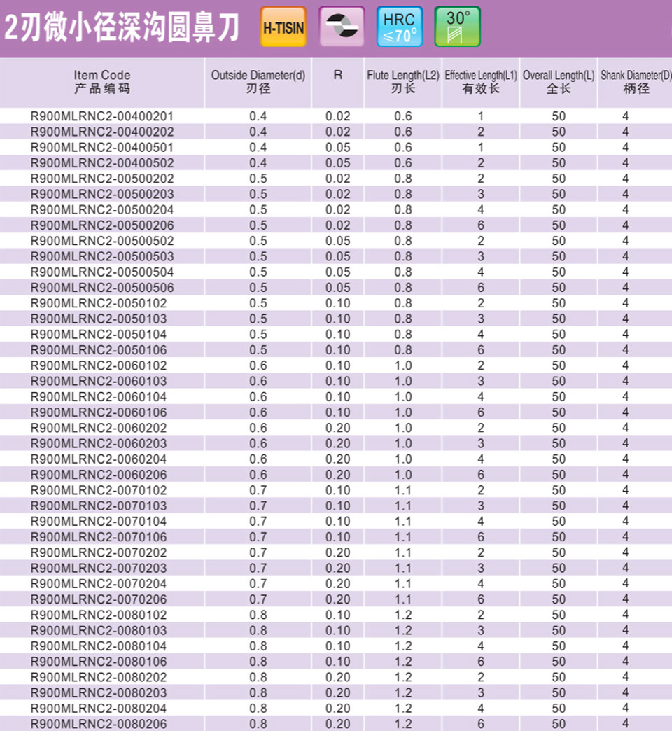 2刃微小徑深溝圓鼻刀
